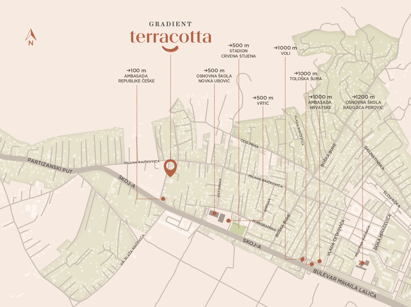 Dobro došli u naš novi rezidencijalni objekat Terracotta u Podgorici, pažljivo osmišljen kako bi pružio mir i udobnost za porodice i pojedince koji traže harmoničan spoj prirode i urbanog života.