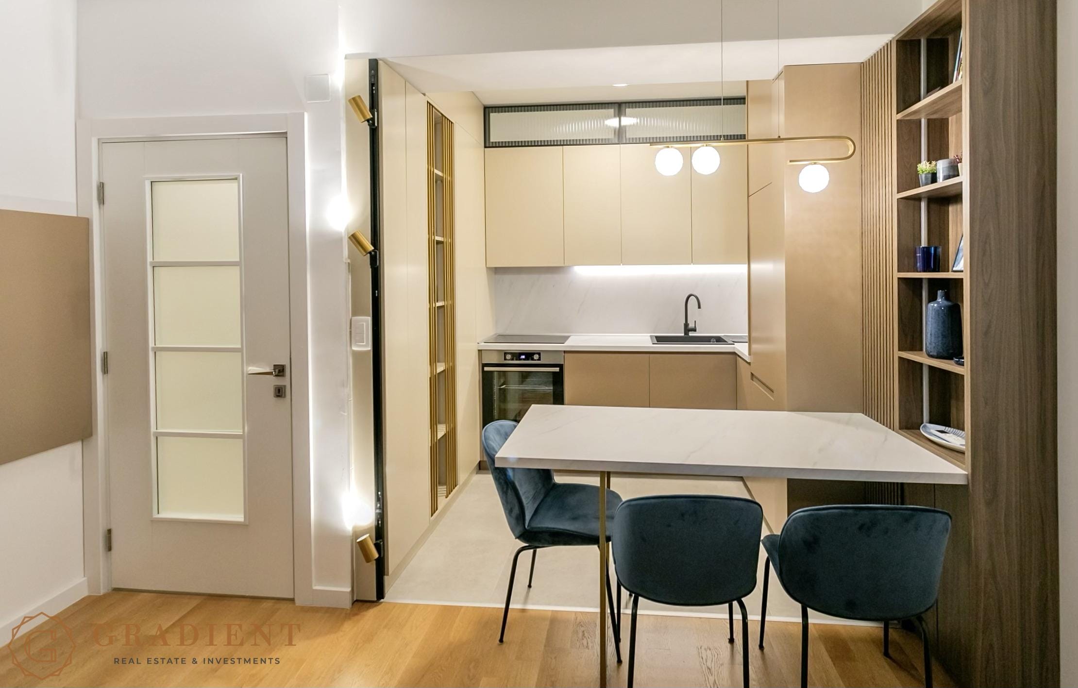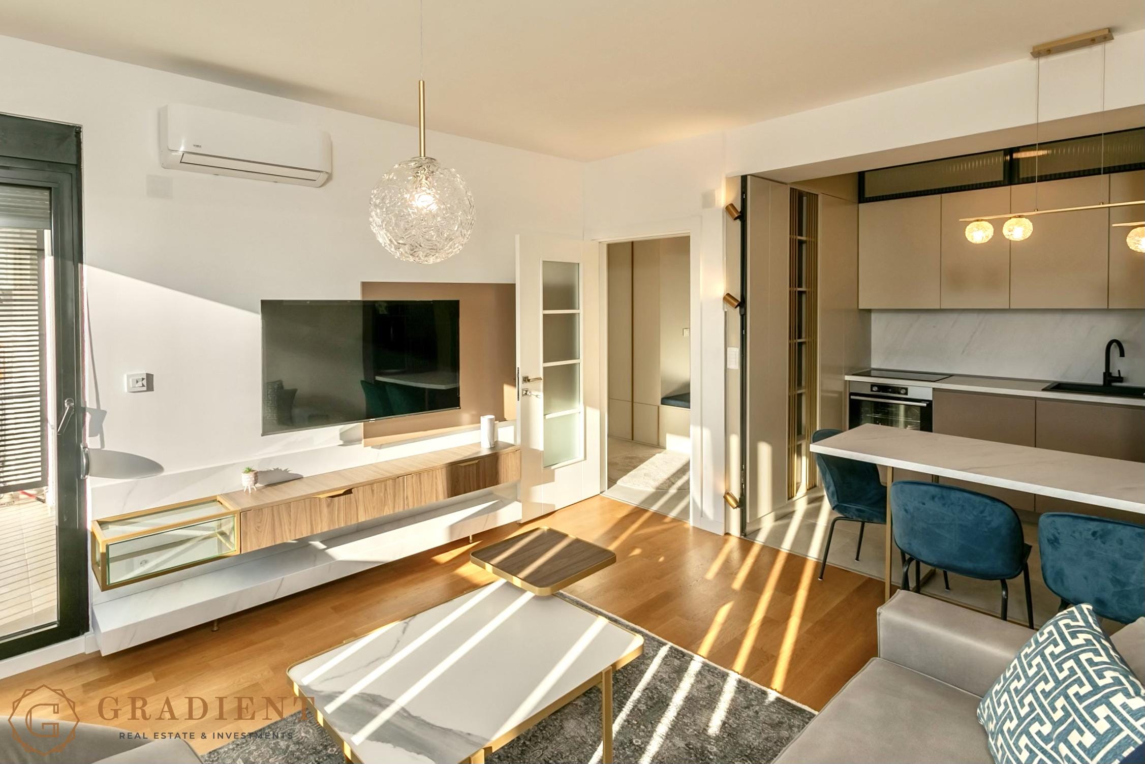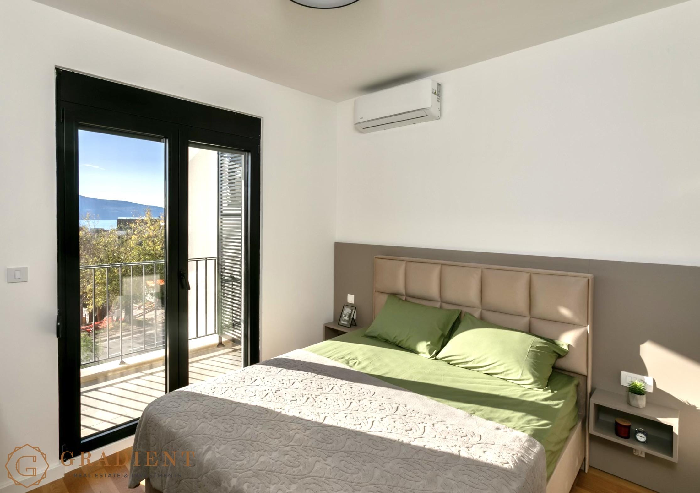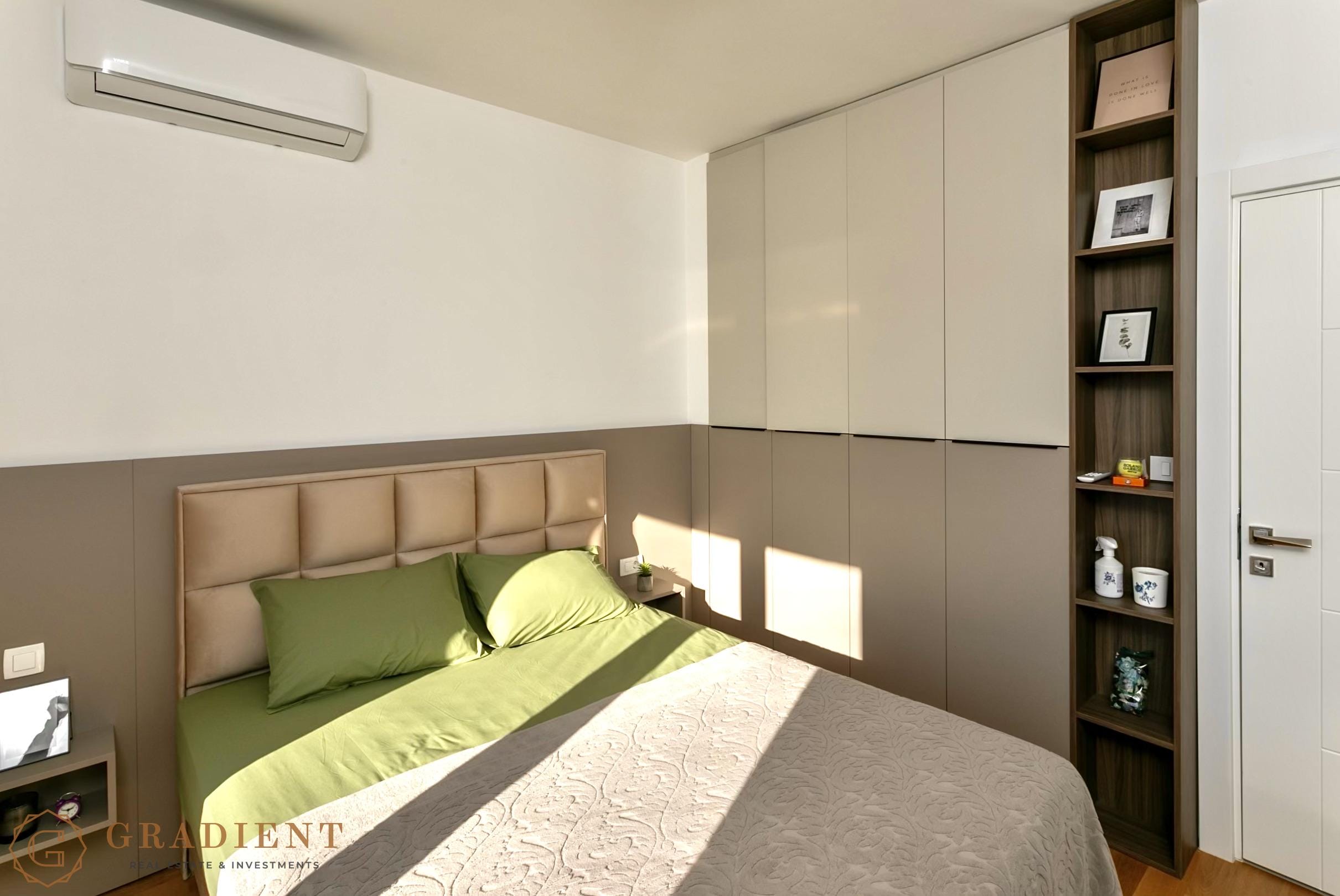 Sastoji se od hodnika, dnevnog boravka sa trpezarijom, moderne kuhinje, udobne spavaće sobe i balkona sa pogledom na more. Stan je kompletno namješten, opremljen kvalitetnim tehničkim uređajima i savremenim detaljima poput alu bravarije, roletni, blind vrata, klima uređaja i podnog grijanja, što pruža dodatni nivo komfora tokom cijele godine.