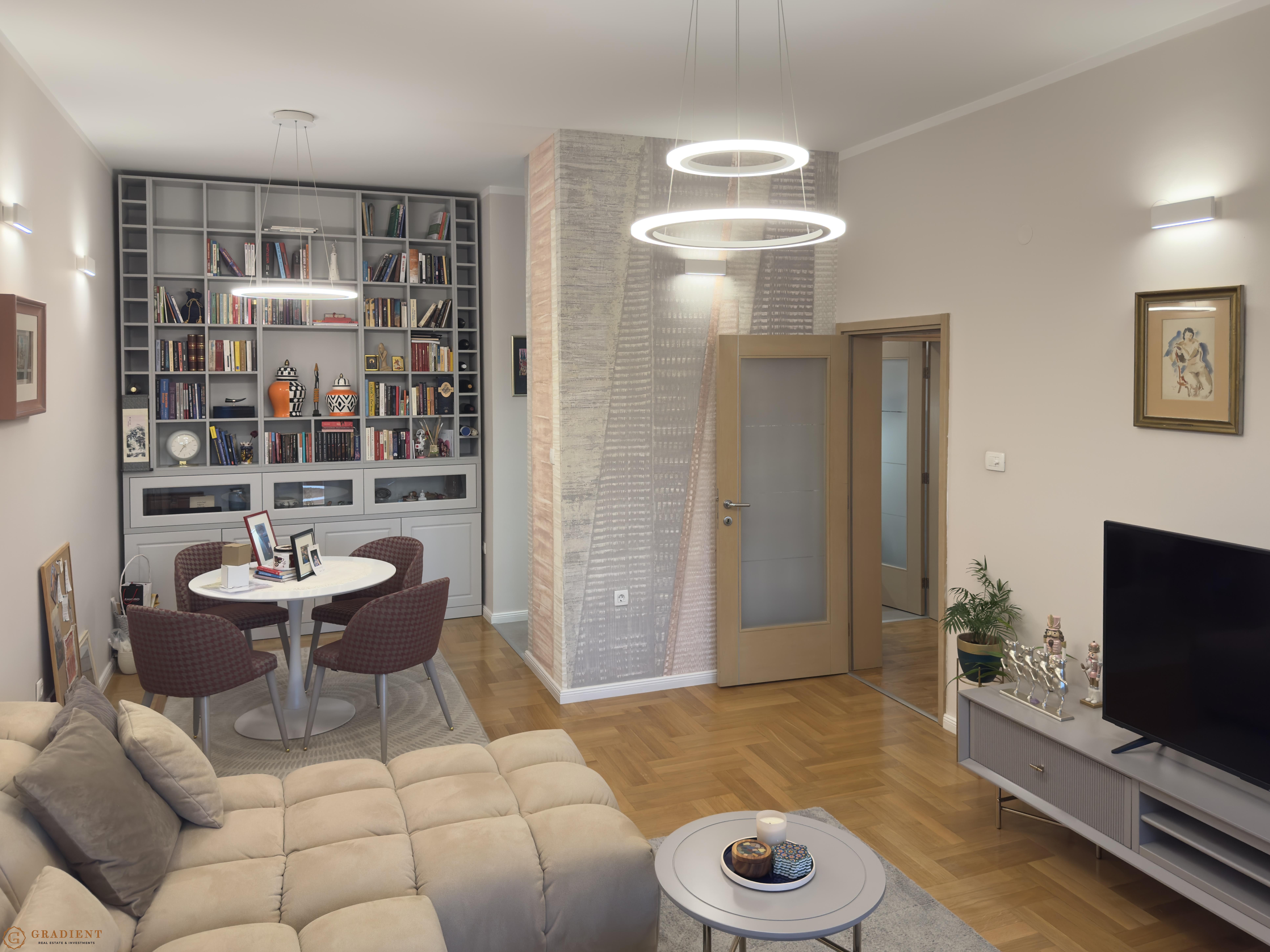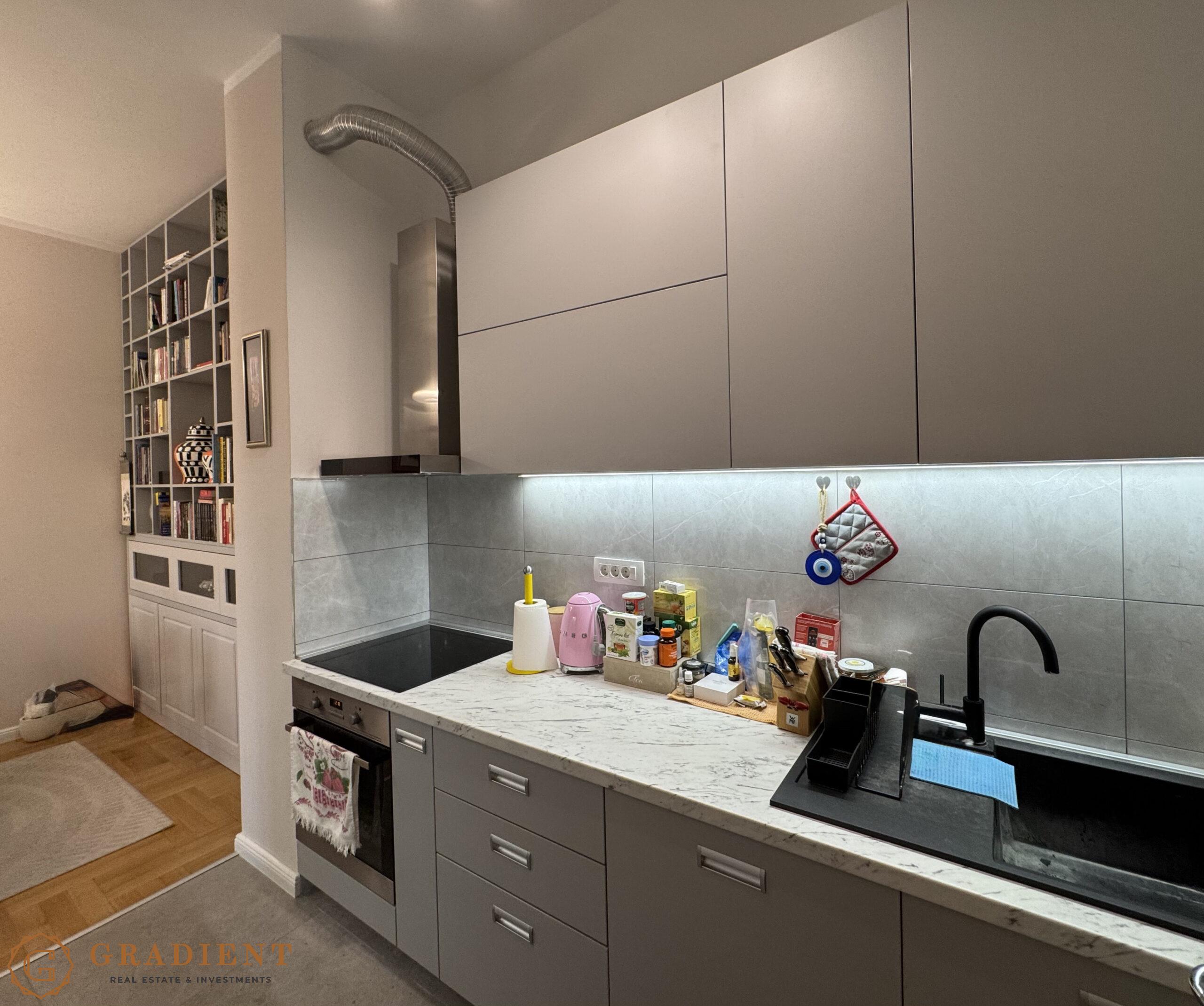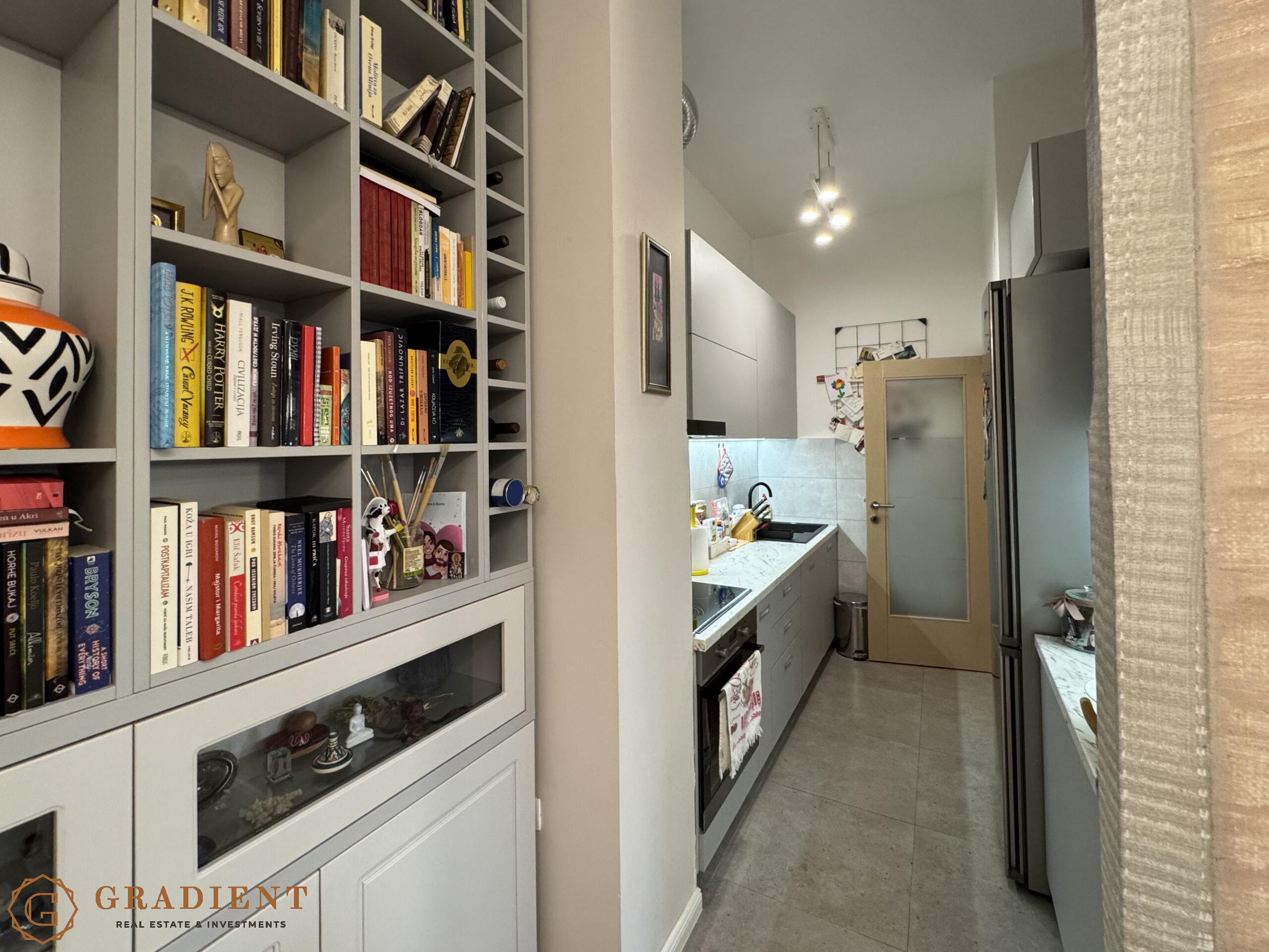The interior is modernly designed and fully equipped – from recently purchased furniture to built-in wardrobes and a library offering extensive storage space. Hardwood flooring in the bedrooms, Tarkett in the hallway, and ceramic tiles in the kitchen and bathroom ensure both practicality and elegance. The kitchen is fully separated and functional, while the central living area seamlessly connects the living room and dining room.