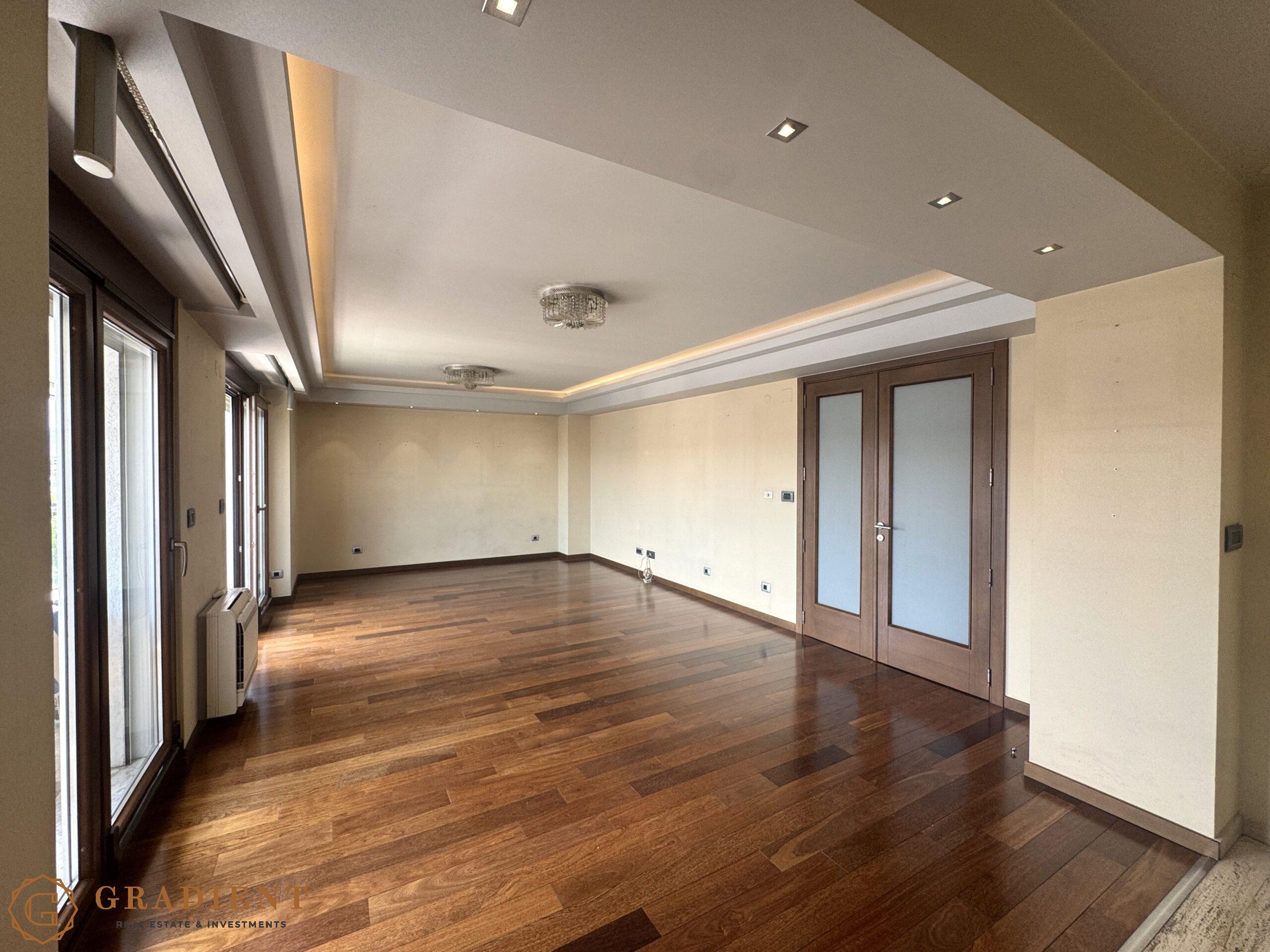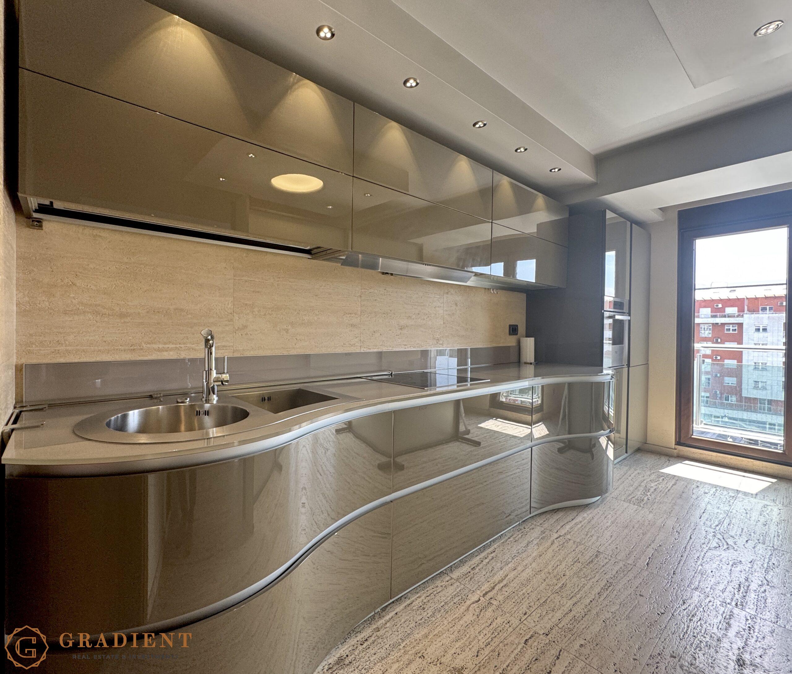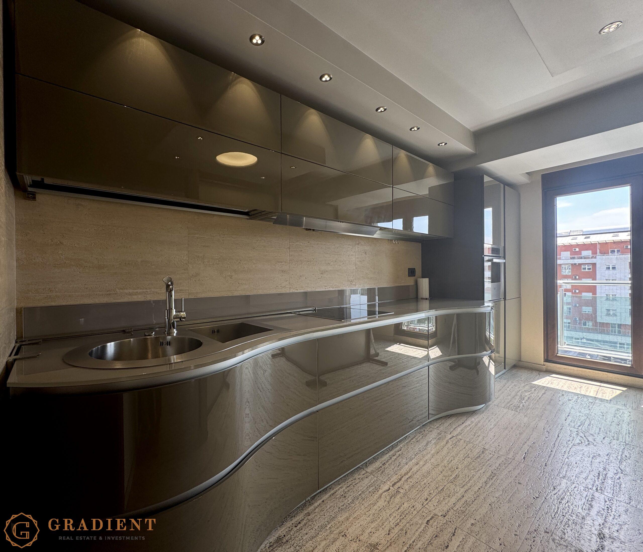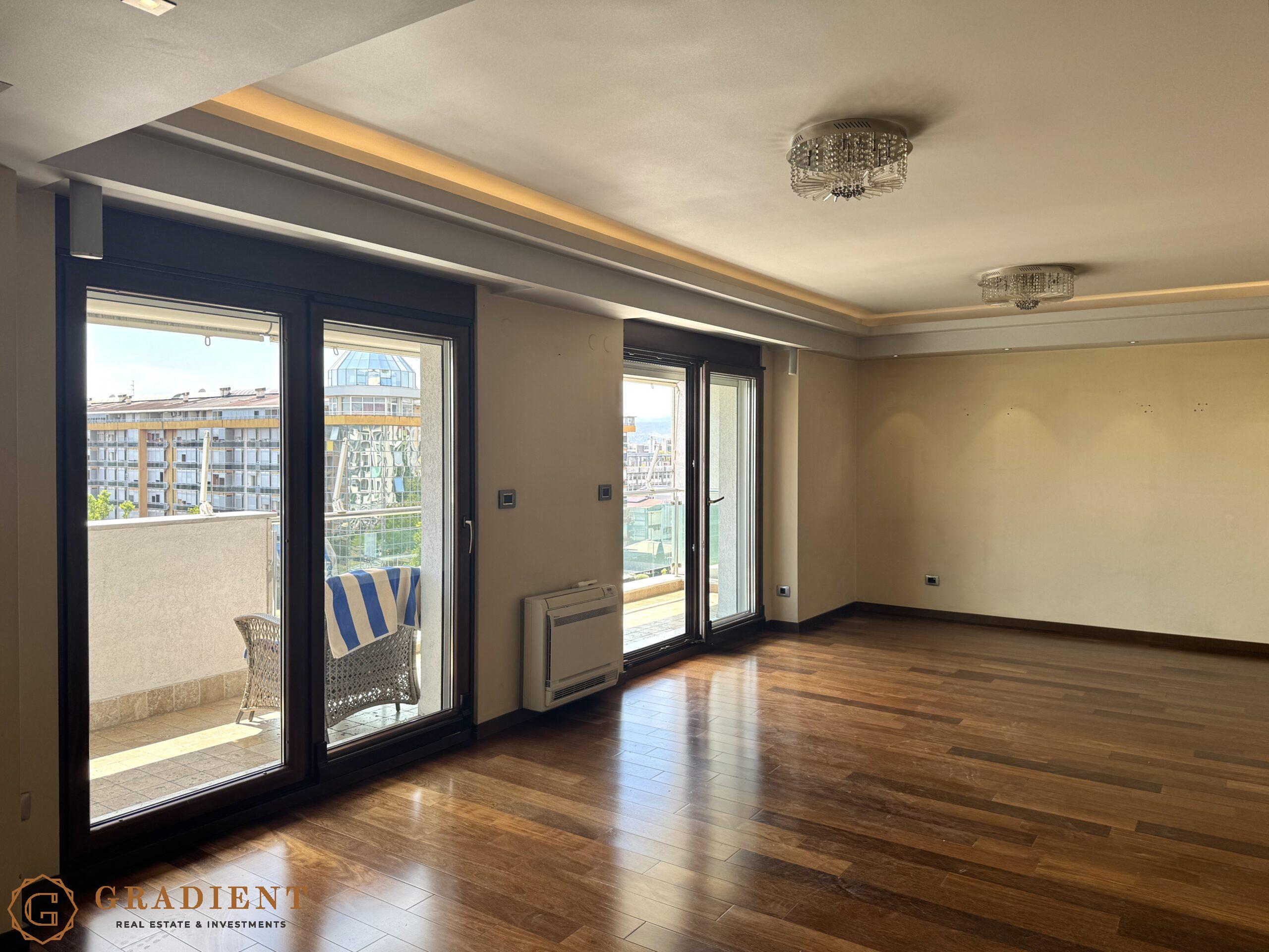 A rare opportunity – spacious and elegantly designed two-bedroom apartment of 142 m², located on the sixth floor of the prestigious Normal Company building on Bulevar Svetog Petra Cetinjskog.