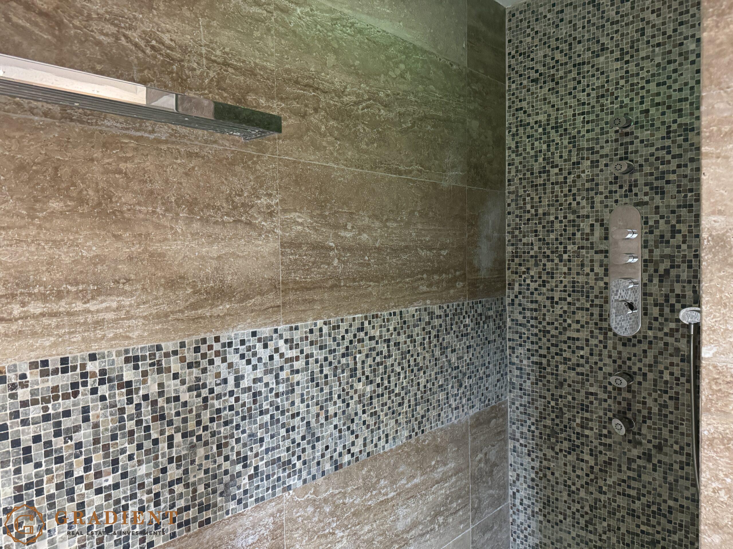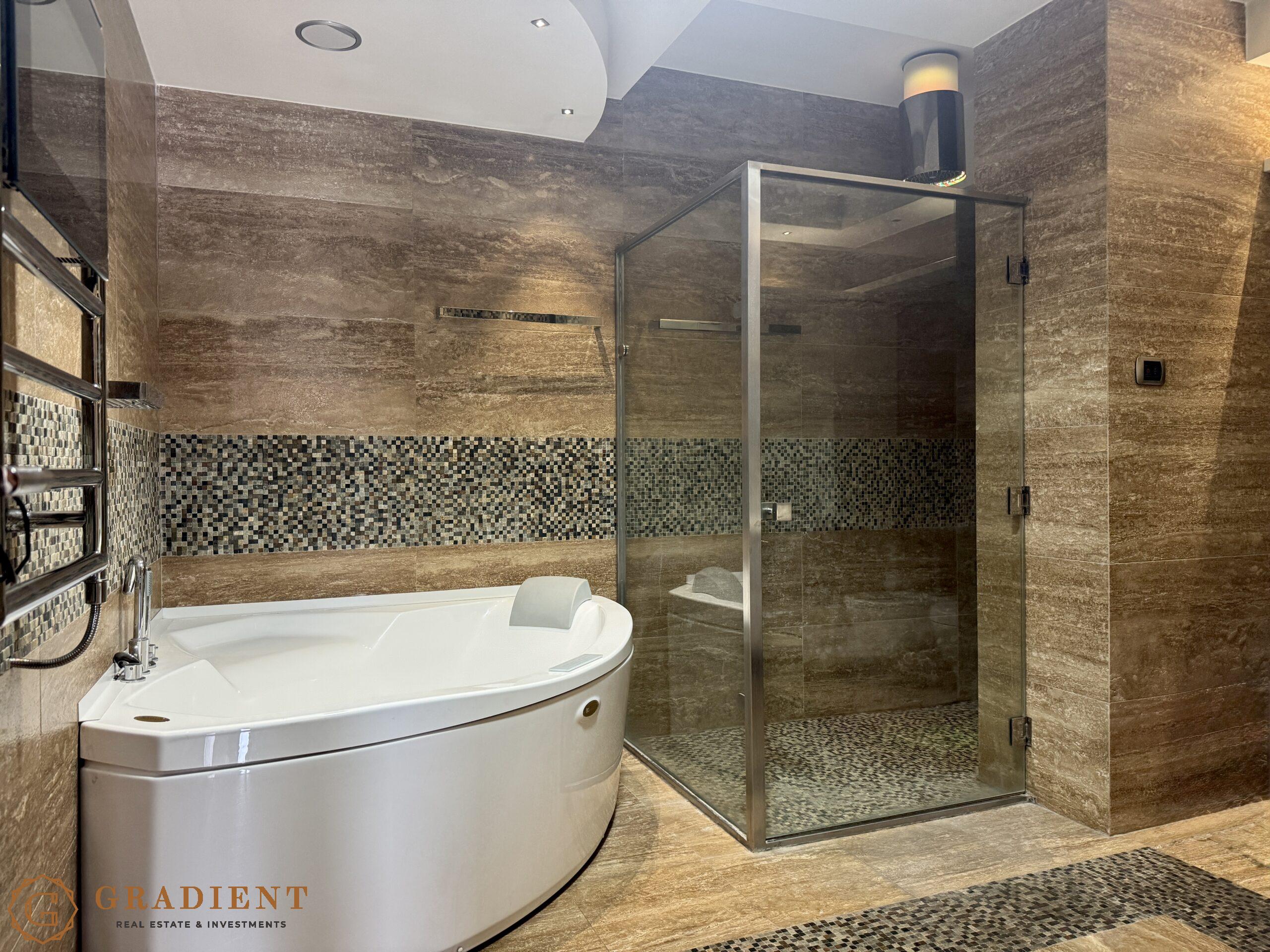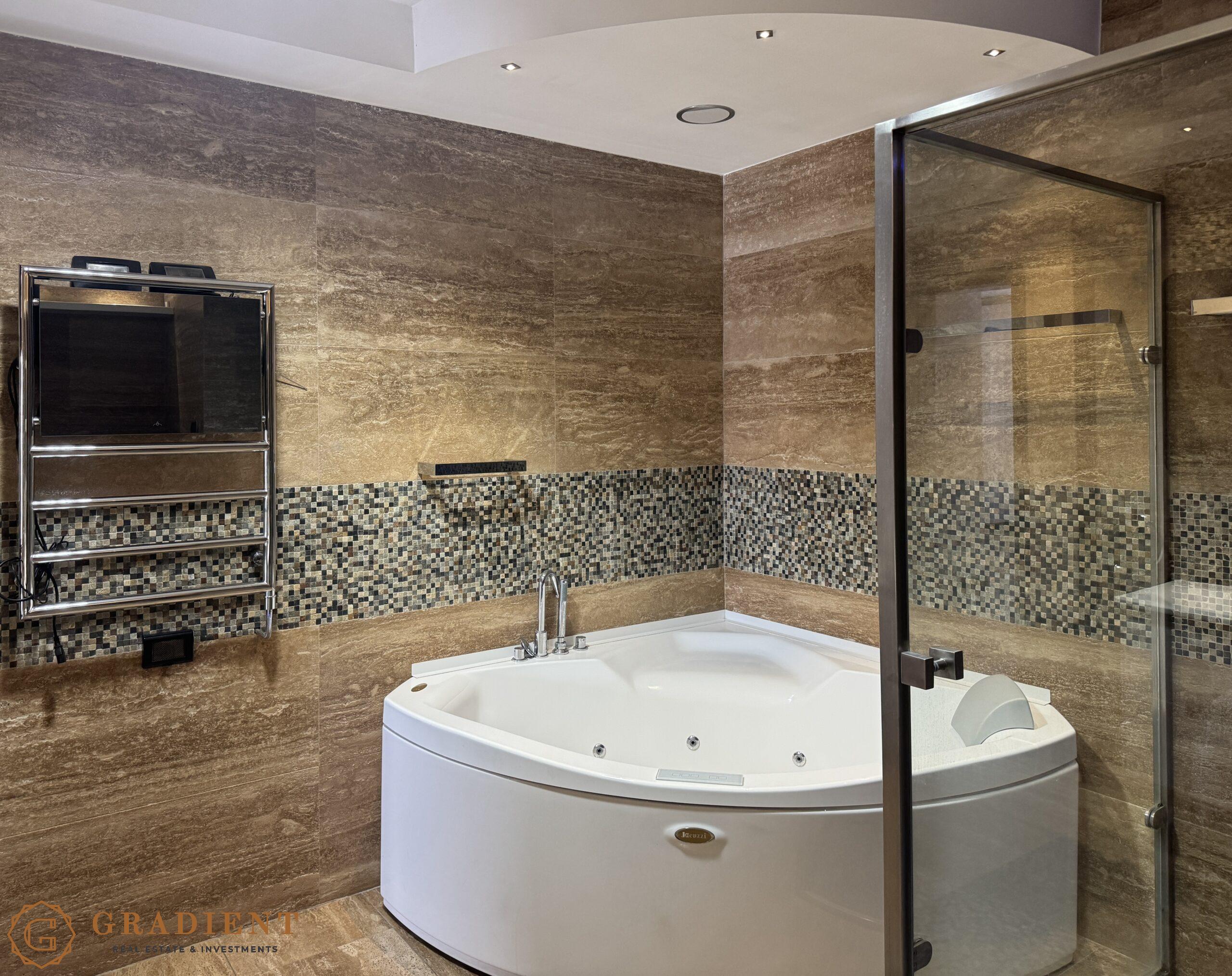 The bathroom provides a full spa-like experience, equipped with a Jacuzzi brand hydromassage tub, eco shower, and a waterproof Aquavision TV. The apartment features a built-in Bang & Olufsen audio system throughout, ambient lighting in suspended ceilings, and a Daikin multi-split air conditioning system. Premium hardwood flooring, high-efficiency aluminum-wood joinery, and a Pedini designer kitchen fitted with Miele and Ariston appliances add to the refined living experience. A 300-liter boiler ensures a high level of everyday comfort.