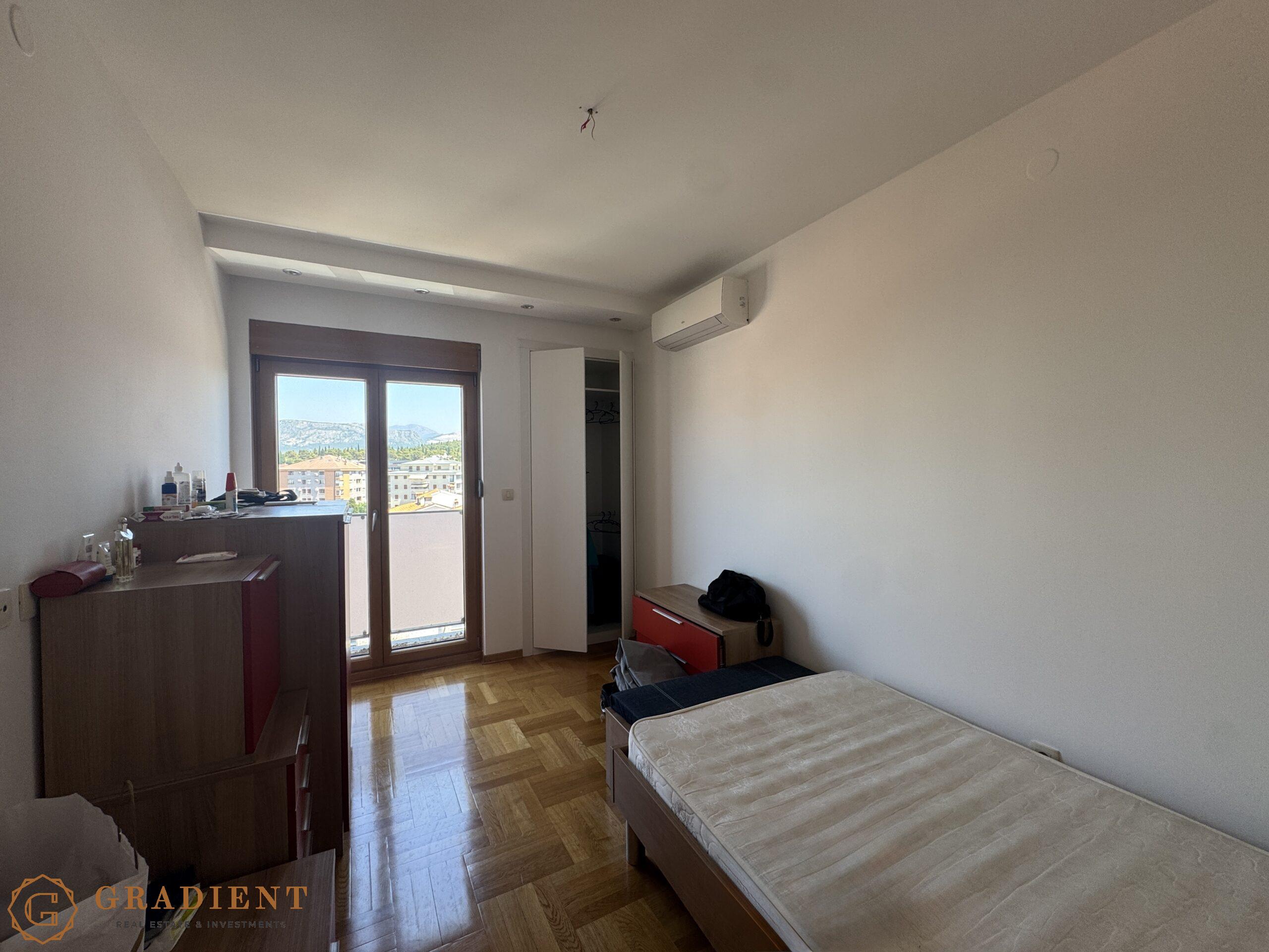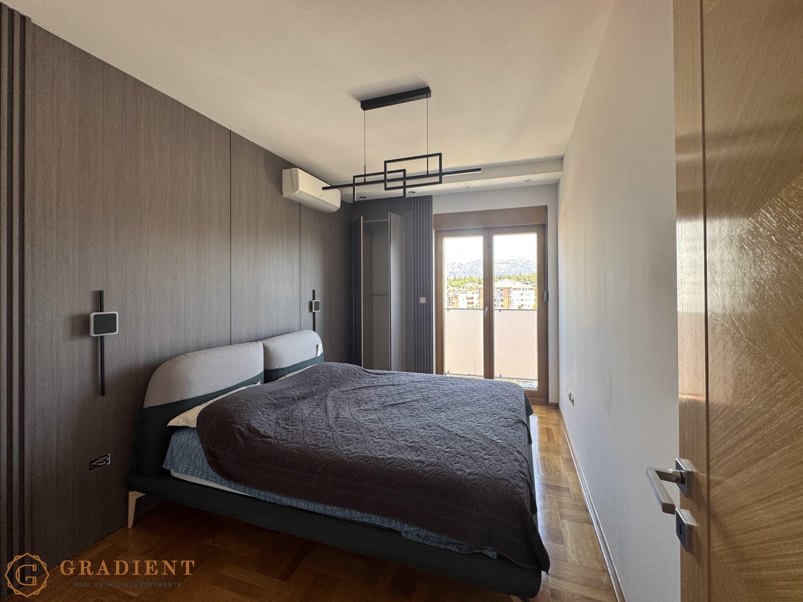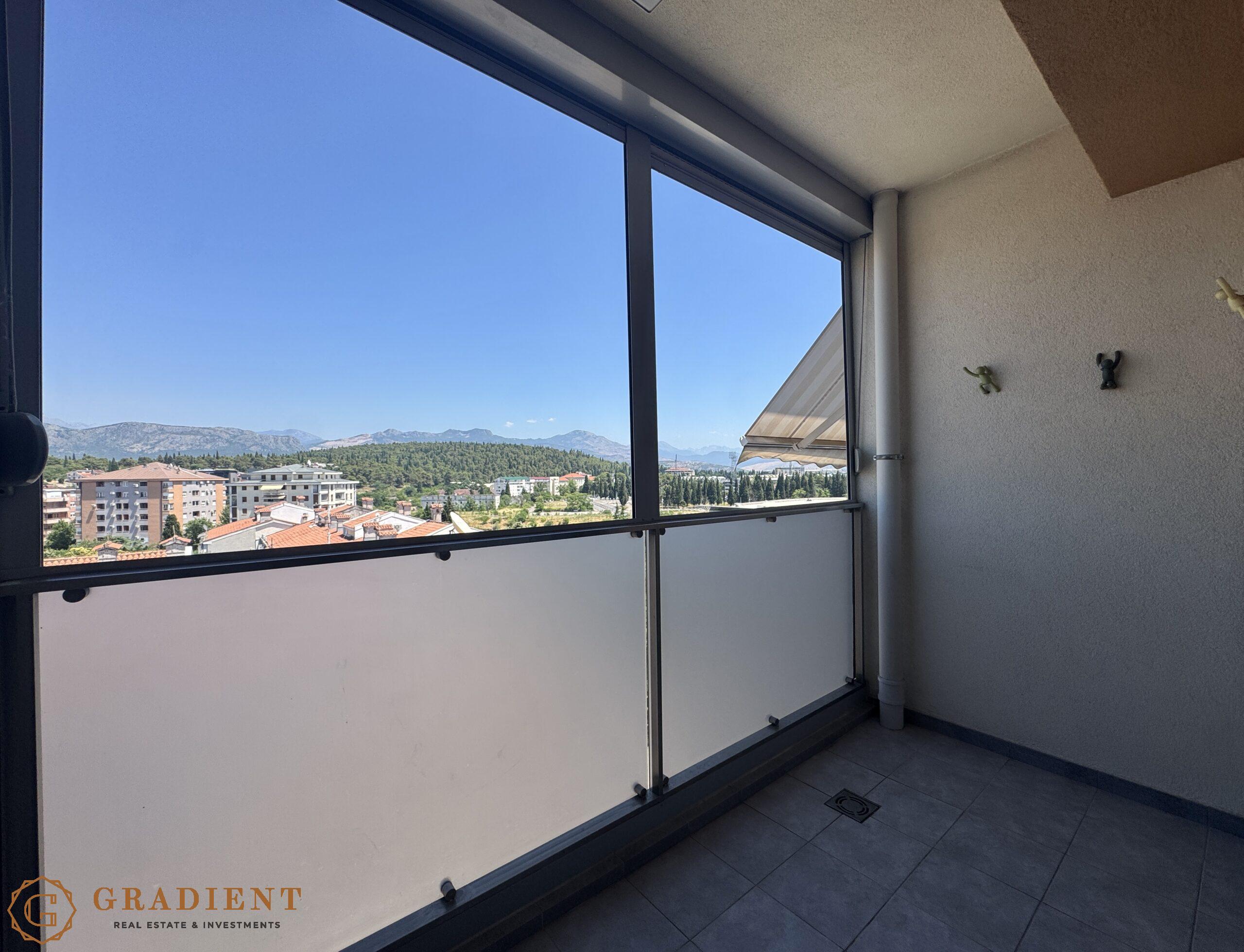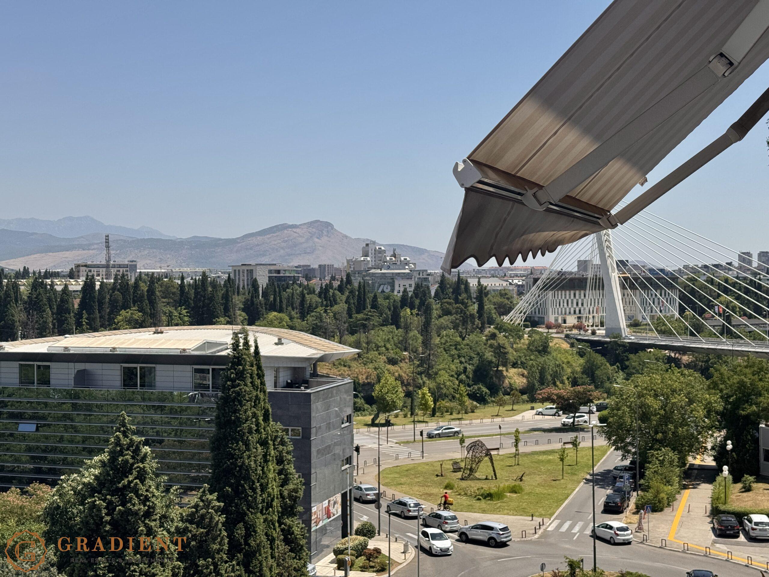 Sa površinom od 92 m², stan nudi komforan i funkcionalan raspored – veliki dnevni boravak povezan sa trpezarijom i kuhinjom izlazi na prostranu terasu s otvorenim pogledom na most Milenijum i brdo Gorica. Dvije spavaće sobe, dva kupatila, gostinski toalet i vešeraj čine ga idealnim izborom za udoban porodični život ili investiciju.