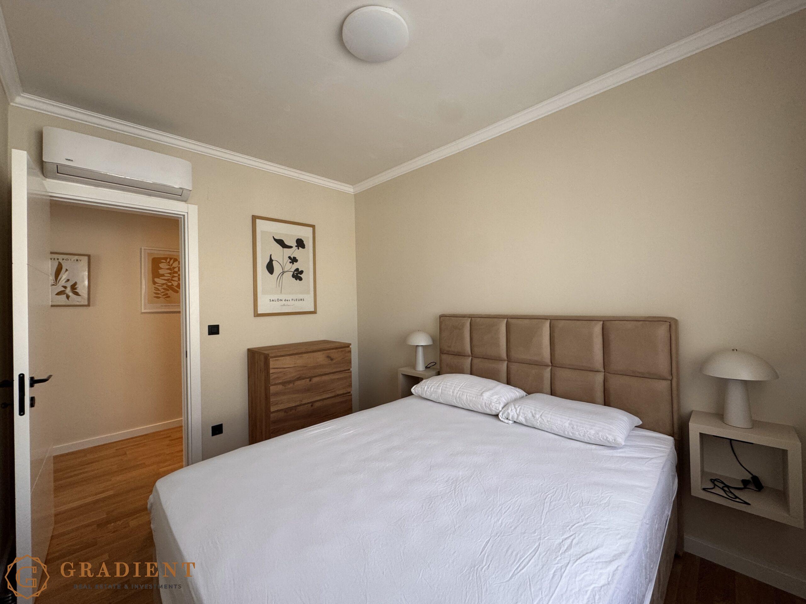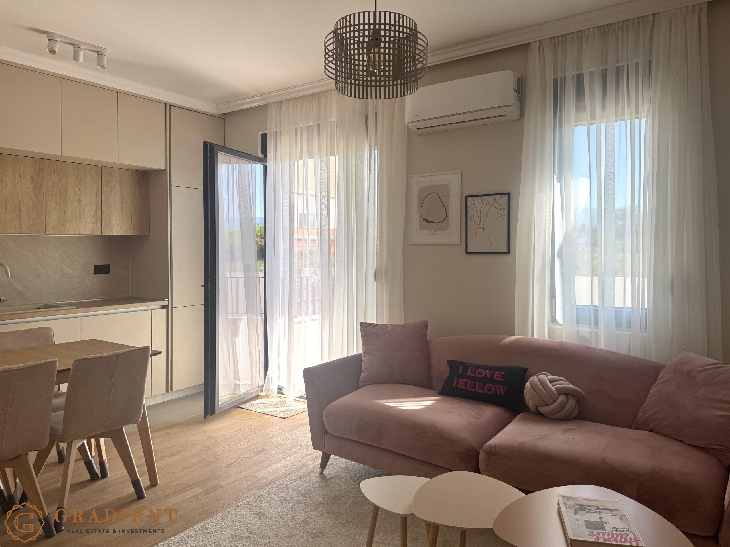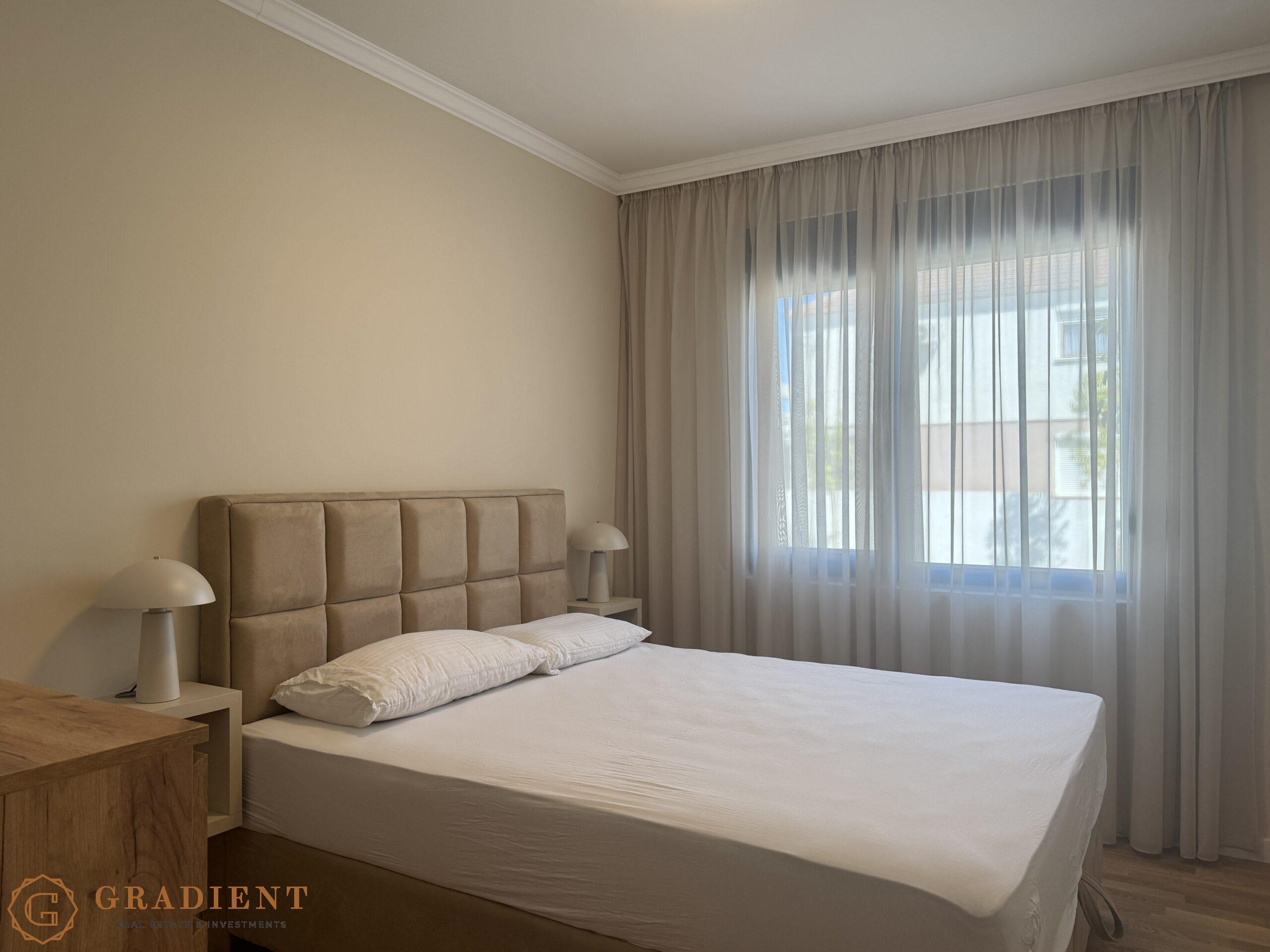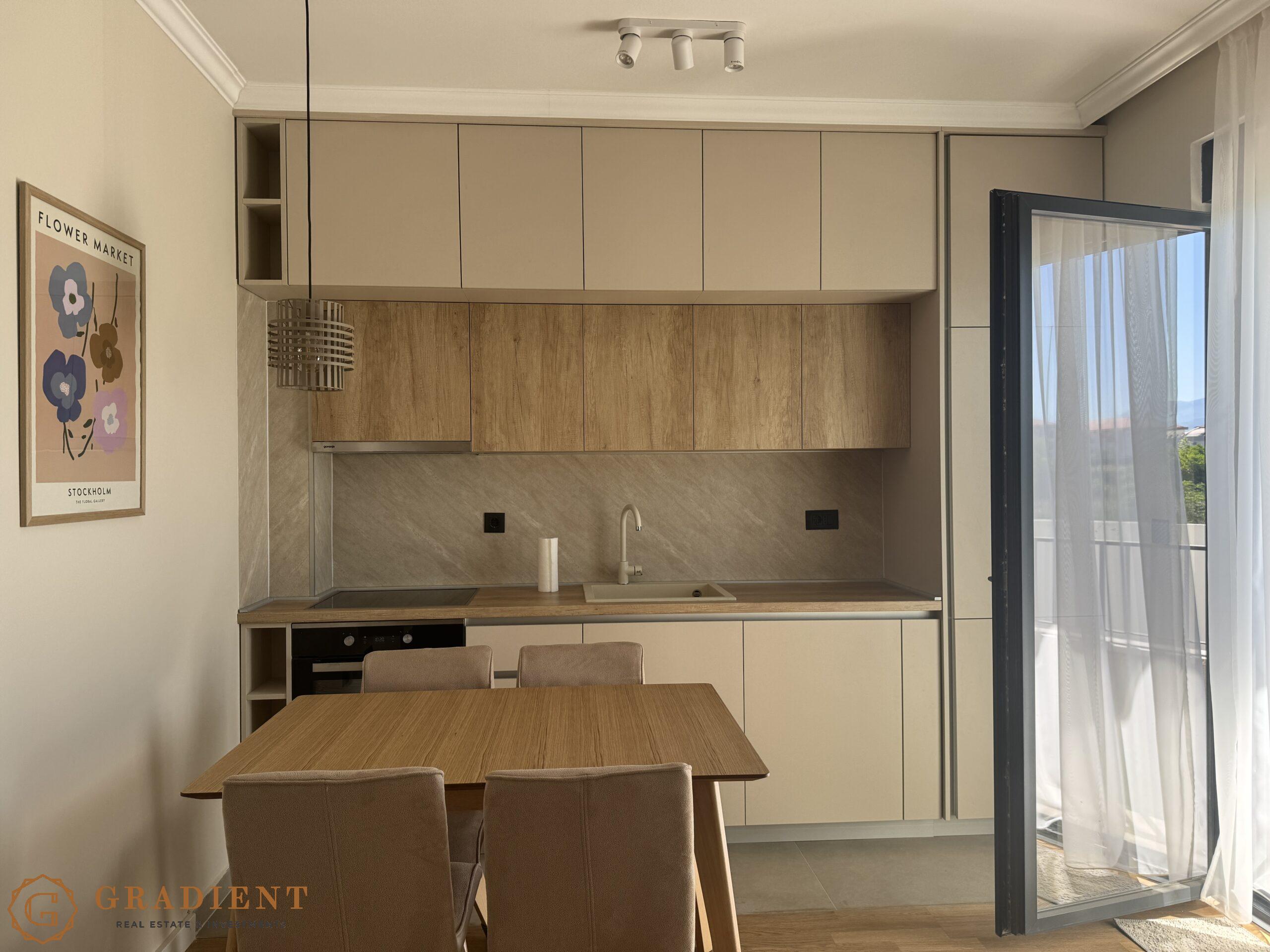 Stan je uređen s posebnom pažnjom na funkcionalnost i estetiku — opremljen kvalitetnim, po mjeri rađenim namještajem, vrhunskom tehnikom, roletnama i multi-split sistemom klimatizacije sa dvije unutrašnje jedinice. Prostorno, čini ga svijetao dnevni boravak sa trpezarijom i kuhinjom, komforna spavaća soba, moderno kupatilo i hodnik sa velikim plakarom i cipelarom. Posebnu vrijednost stanu daje privatno, uređeno dvorište površine 15 m², koje nudi dodatni osjećaj komfora i udobnosti.