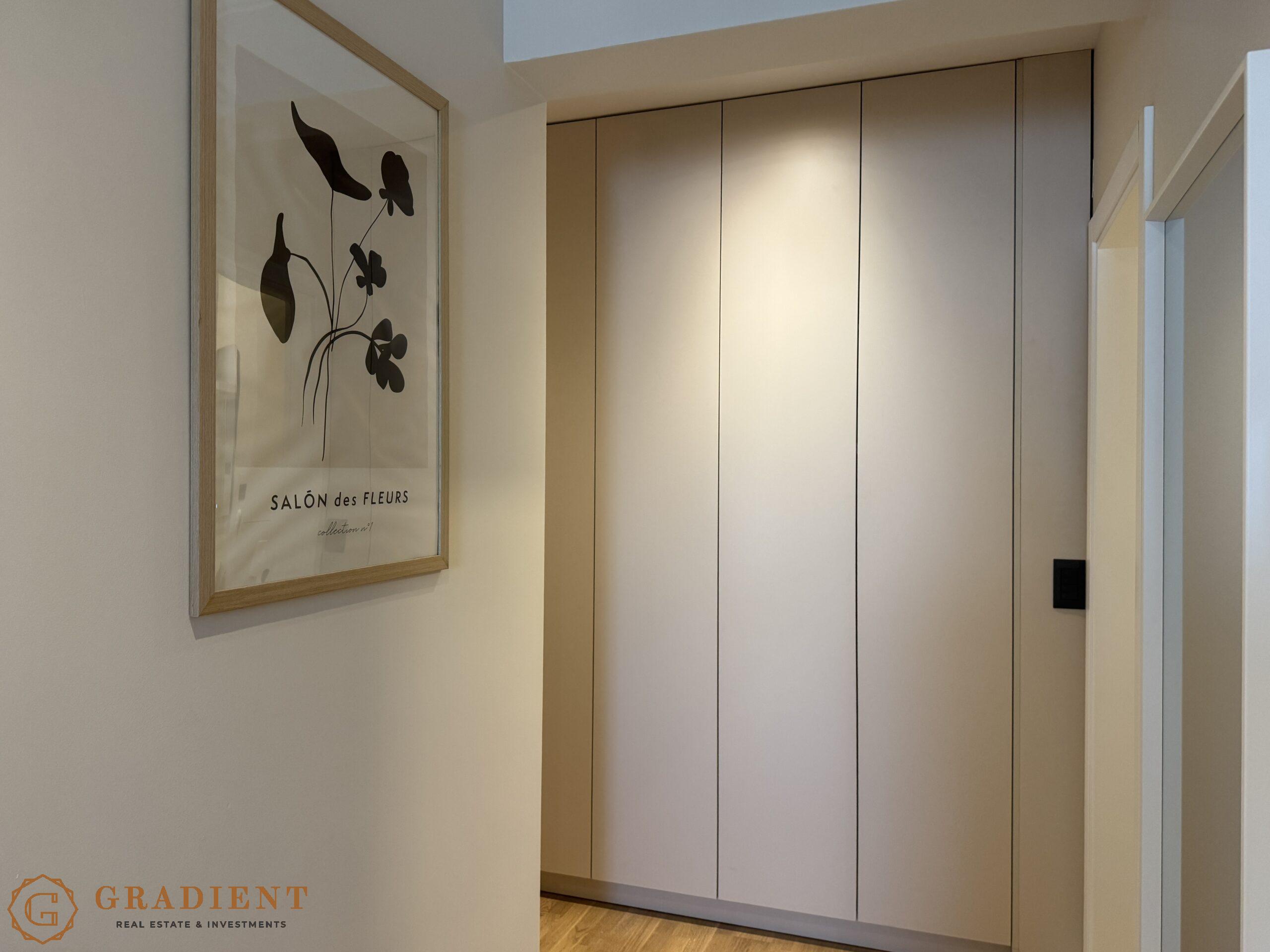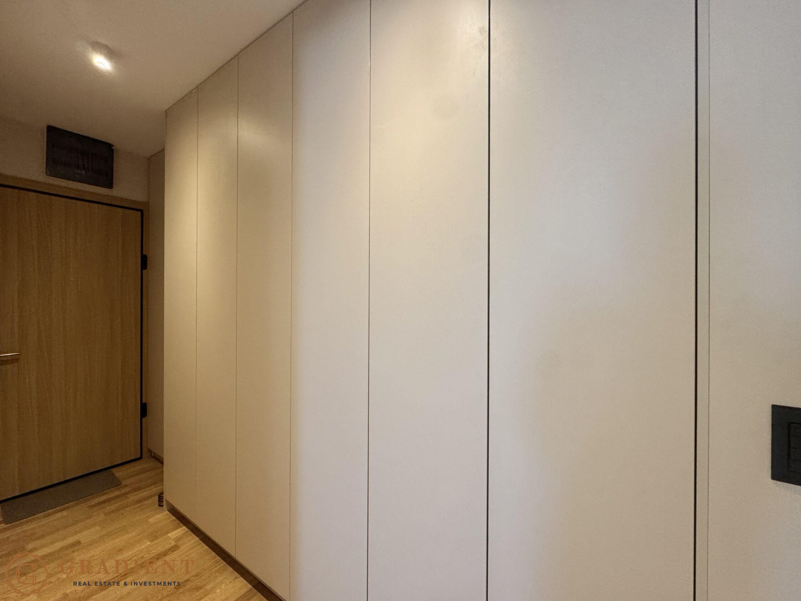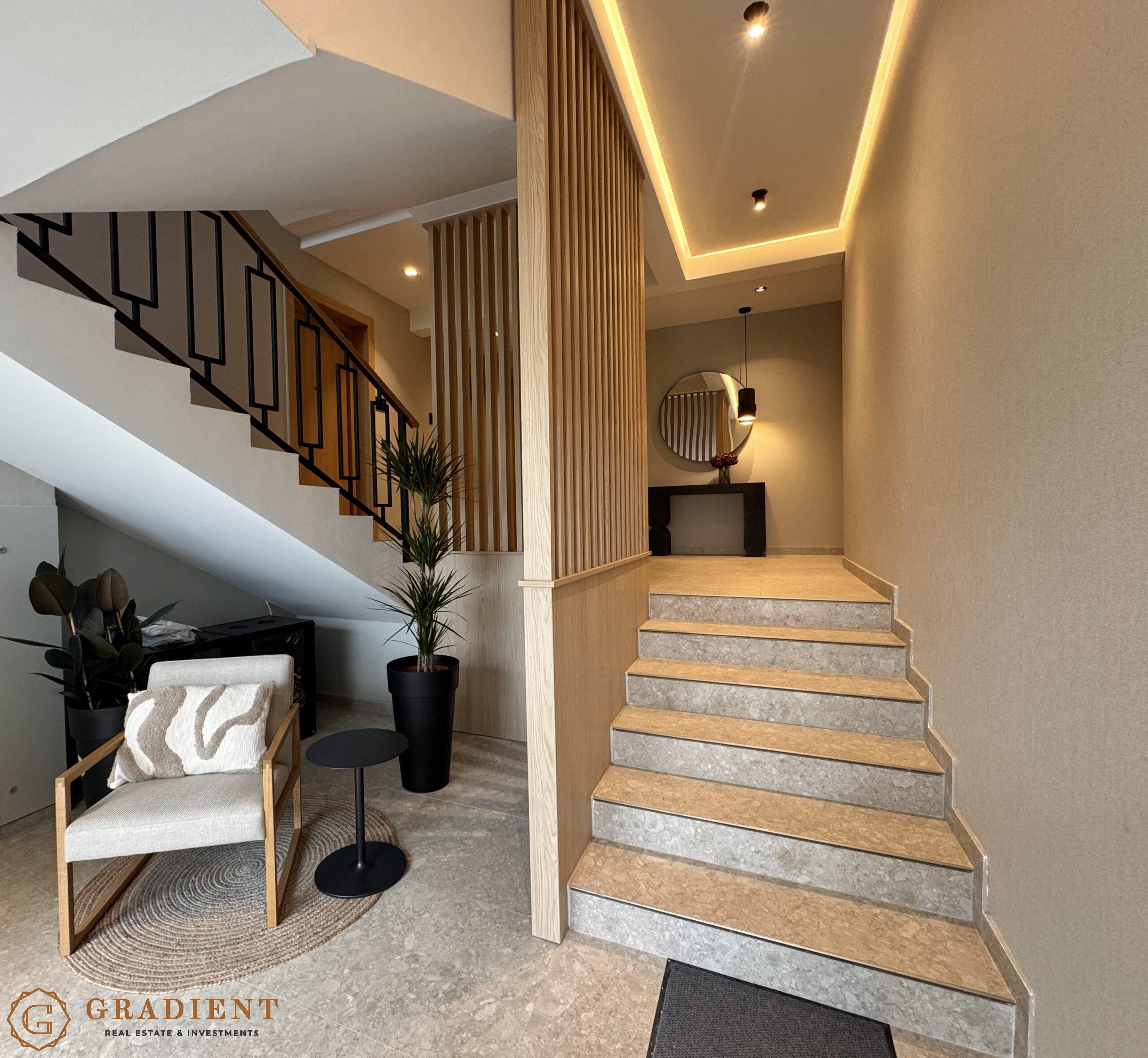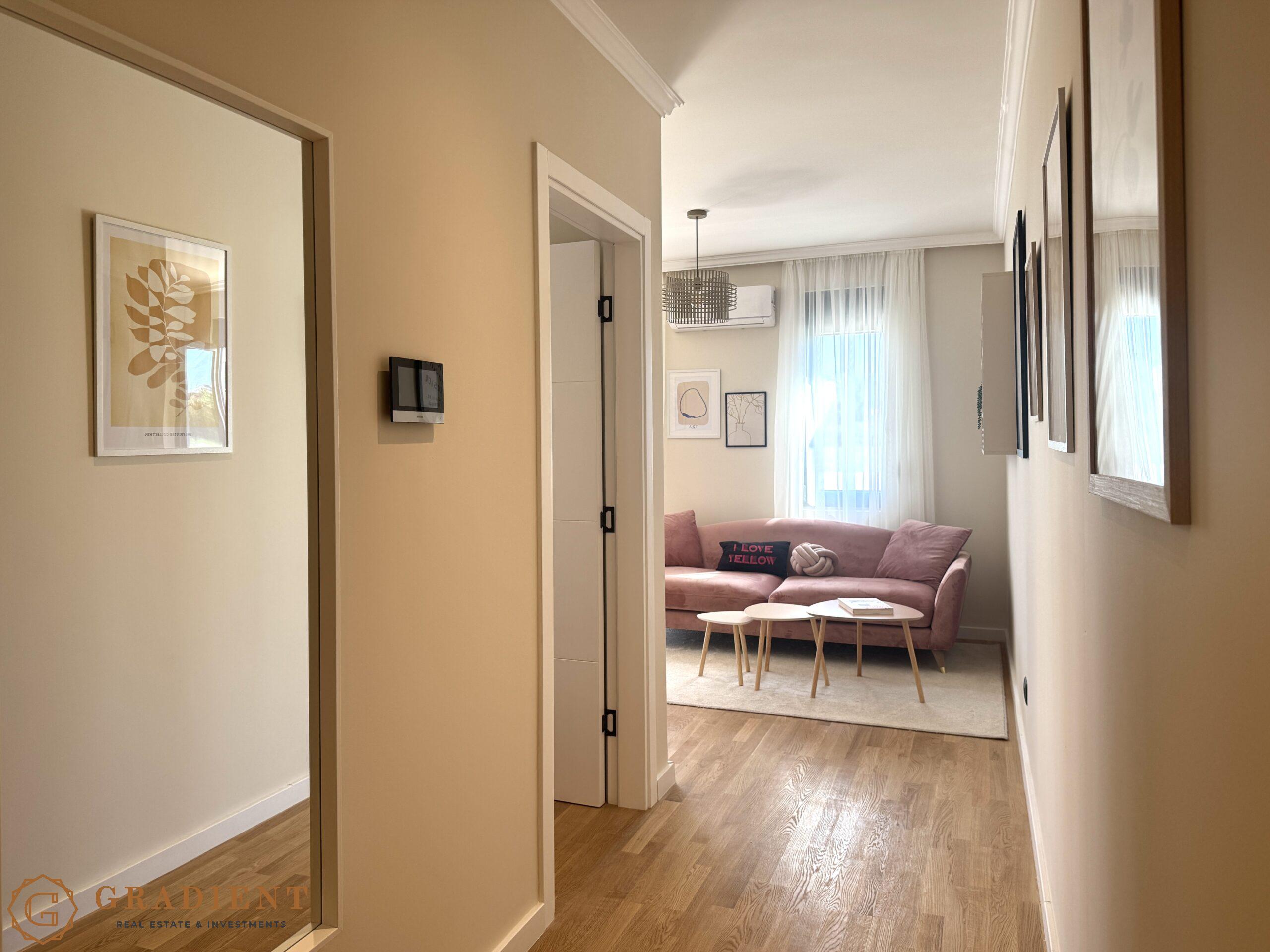 Stan je uređen s posebnom pažnjom na funkcionalnost i estetiku — opremljen kvalitetnim, po mjeri rađenim namještajem, vrhunskom tehnikom, roletnama i multi-split sistemom klimatizacije sa dvije unutrašnje jedinice. Prostorno, čini ga svijetao dnevni boravak sa trpezarijom i kuhinjom, komforna spavaća soba, moderno kupatilo i hodnik sa velikim plakarom i cipelarom. Posebnu vrijednost stanu daje privatno, uređeno dvorište površine 15 m², koje nudi dodatni osjećaj komfora i udobnosti.