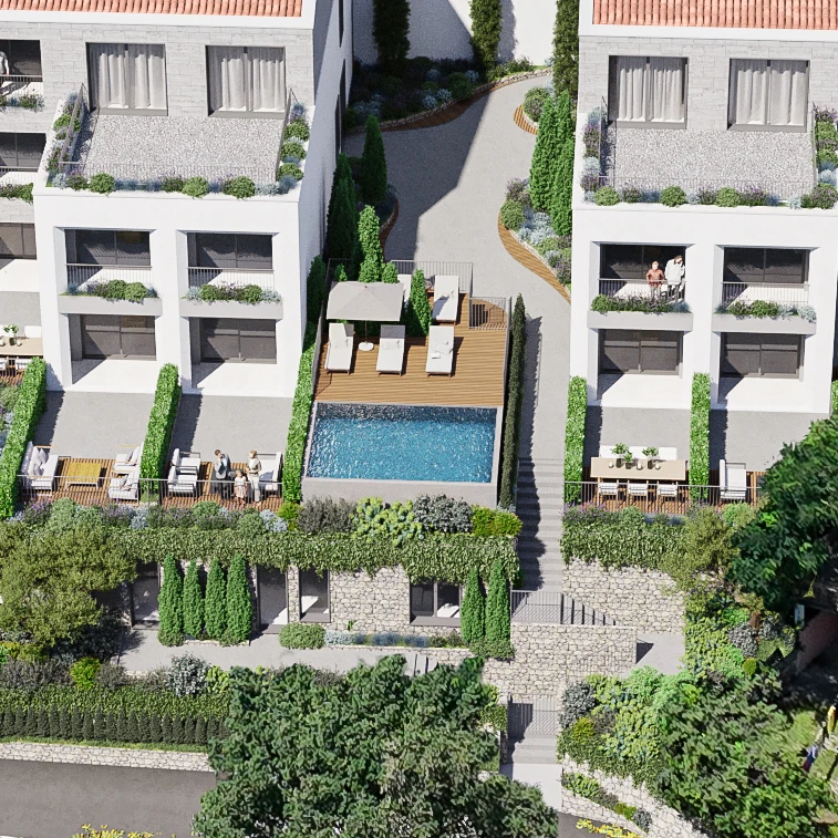 Privatni bazen dostupan svim vlasnicima, okružen zelenilom za potpuni užitak.